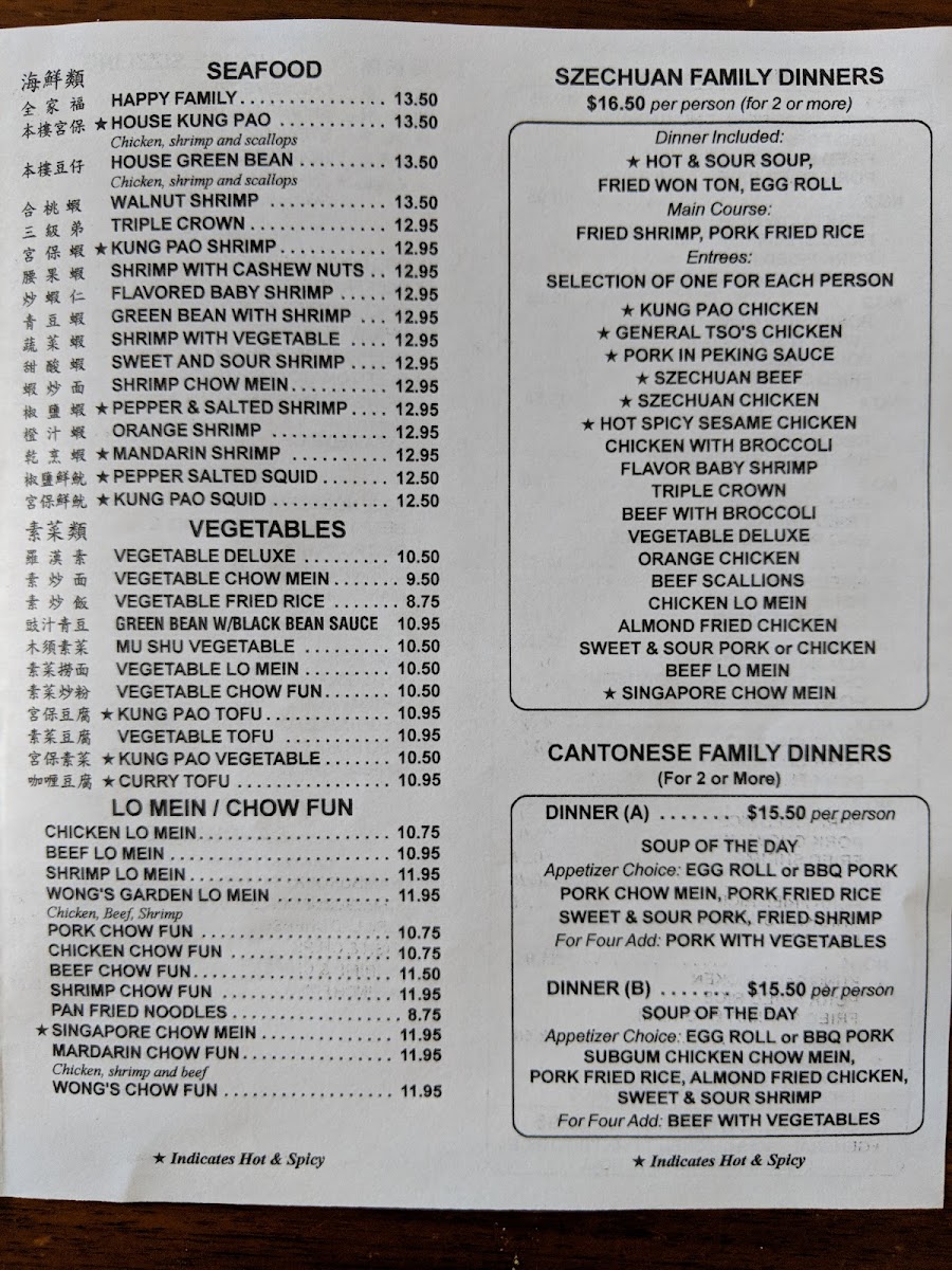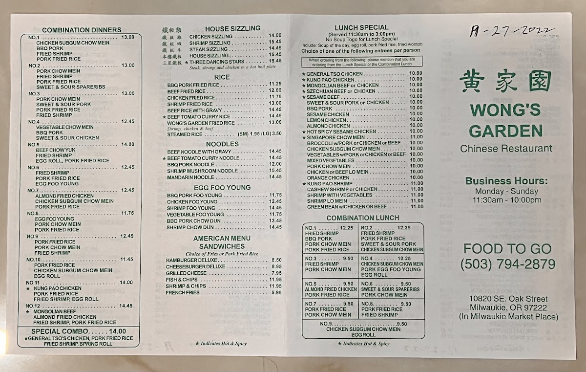 Welcome to Wong's Garden, a delightful Chinese restaurant located at 10820 SE Oak St, Portland, OR. Here, you can explore a menu filled with authentic flavors and hearty portions, perfect for family gatherings or casual meals. One highlight is their Szechuan Family Dinner, ideal for two or more, featuring hot and sour soup, fried wontons, egg rolls, fried shrimp, and pork fried rice—all for just US$47.90.