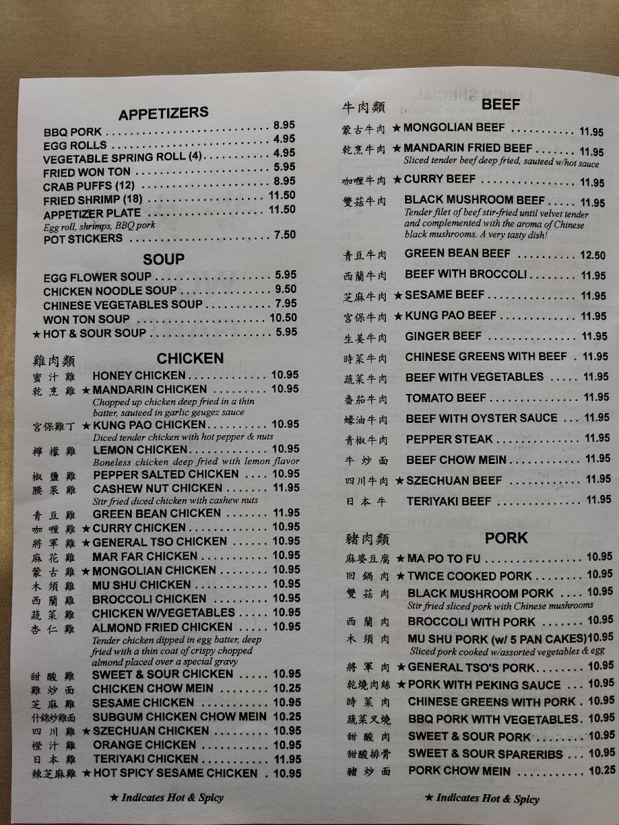 Spicy. Mongolian beef, almond fried chicken, fried shrimp, and pork fried rice.